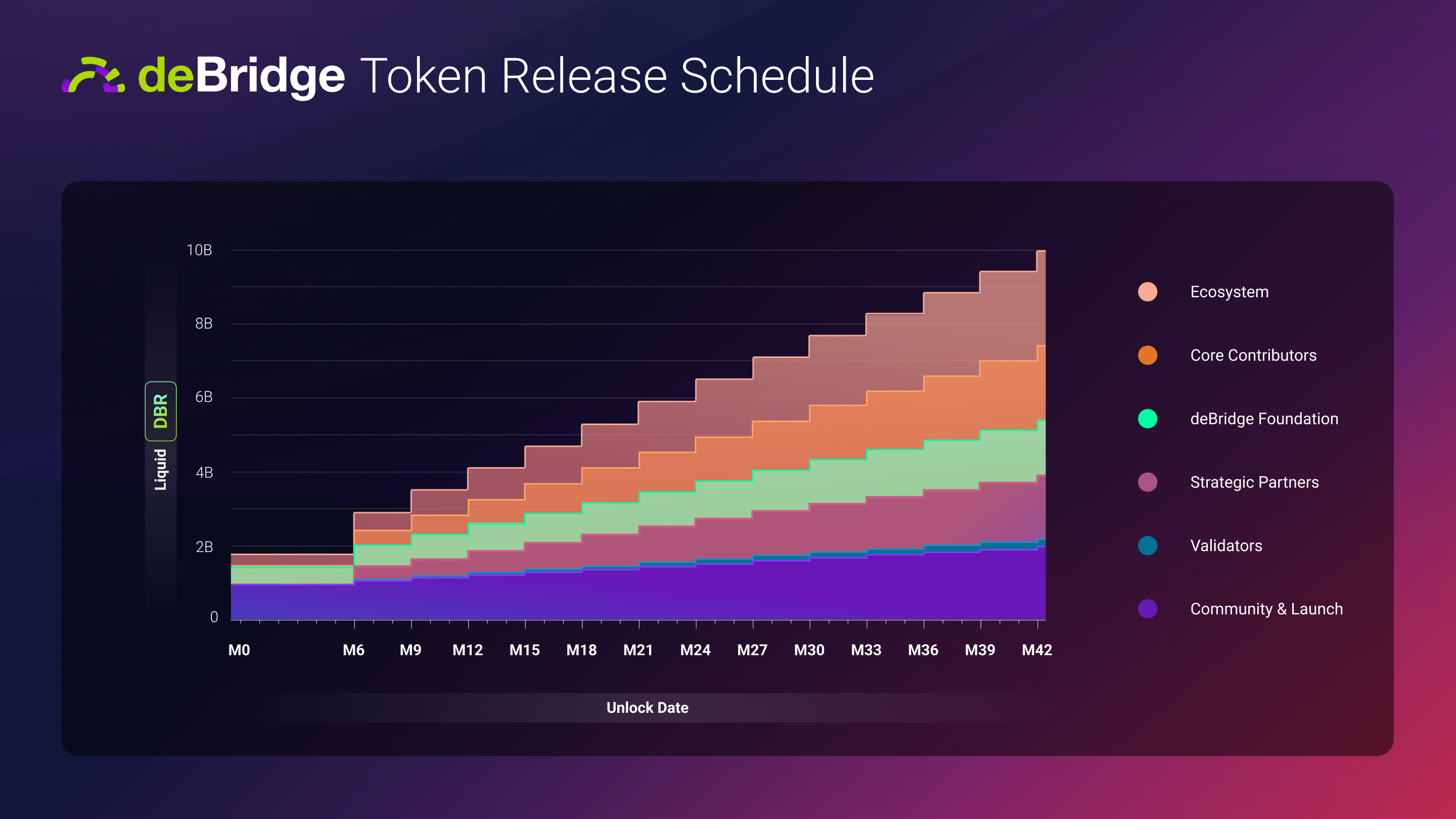 As per tokenomics, DBR’s launch circulating supply will be 1.8 billion SPL tokens on Solana (18% of a total supply of 10 billion tokens). The initial allocation spans various categories, including Community & Launch, Ecosystem, and the deBridge Foundation, to ensure the continuous development of an ecosystem as a whole.
