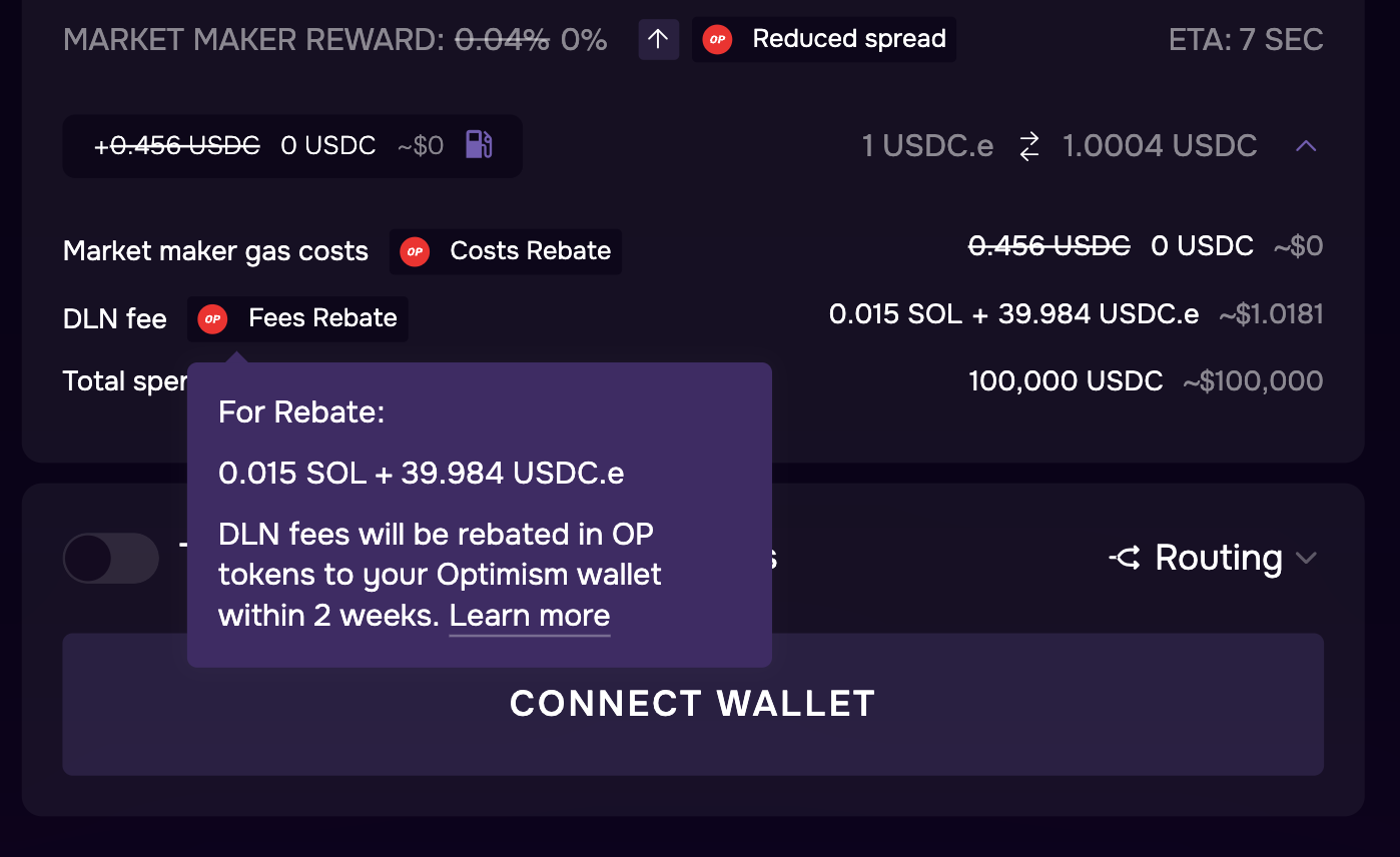 Trades TO Optimism: If you make a value transfer/bridge to Optimism, you will receive the entire DLN fee amount as an OP rebate. For instance: if your cost was $3 to move from Polygon to Optimism (in total including variable (4bps) and fixed fee), you will receive $3 worth of fee rebates in OP. It’s important to note that transaction fees (gas costs) for both users and takers will be rebated in full in OP tokens as well. Also, the spread is reduced by 4 bps of the market maker incentive as market makers are incentivized in OP tokens from the grant. To verify the exact amount of fees to be rebated, hover the mouse over the "Fees Rebate" badge: