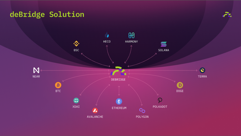 deBridge is a cross-chain interoperability and liquidity transfer protocol that allows decentralized transfer of assets between various blockchains. The cross-chain intercommunication of deBridge smart contracts is powered by a network of independent oracles/validators elected by deBridge governance. deBridge protocol is an infrastructure platform and hooking service for: