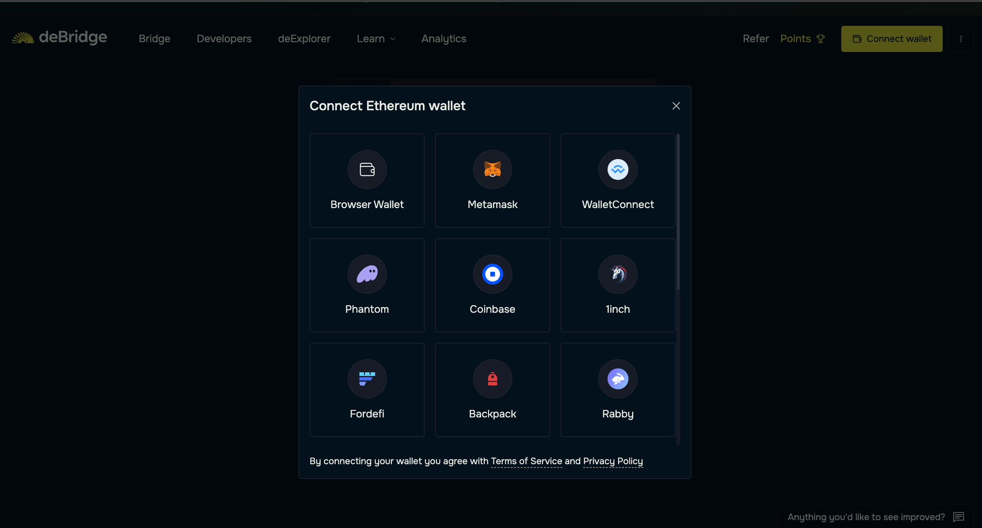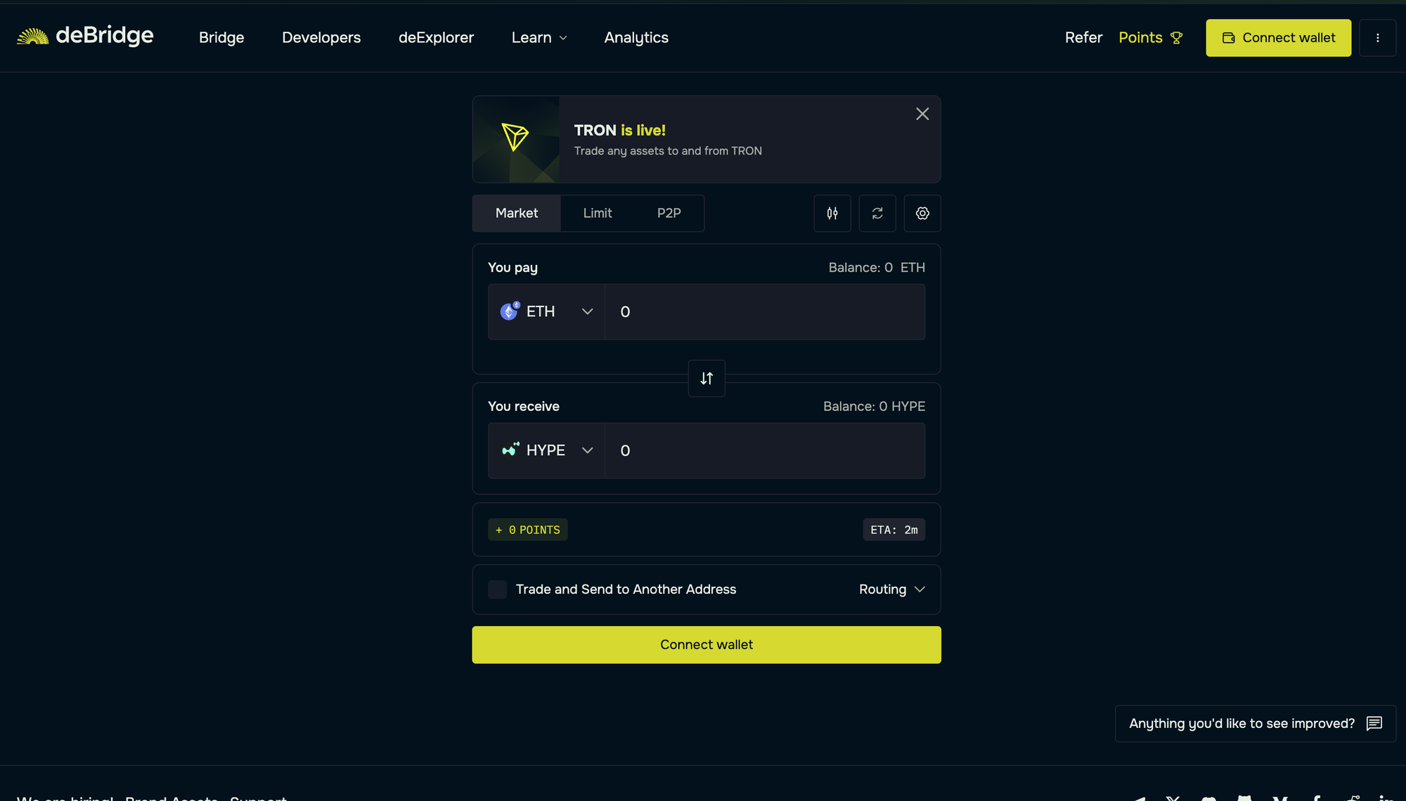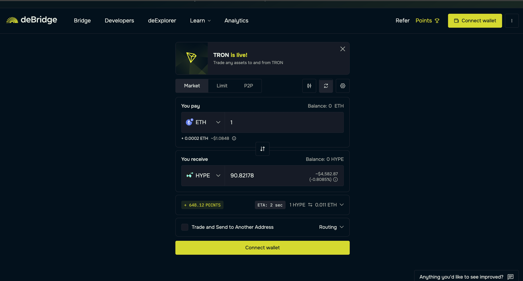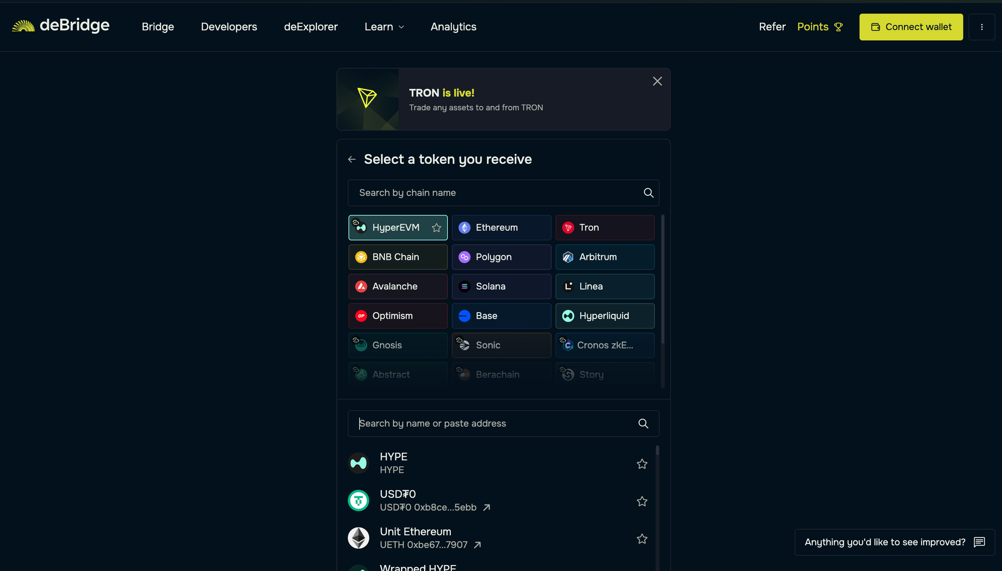deBridge provides an instant bridging solution to help you bridge assets between HyperEVM and any asset on any chain and vice versa. Let's walk through the steps involved to perform bridging for your crypto assets in a few simple steps: